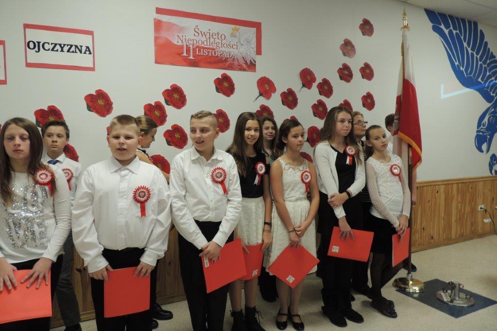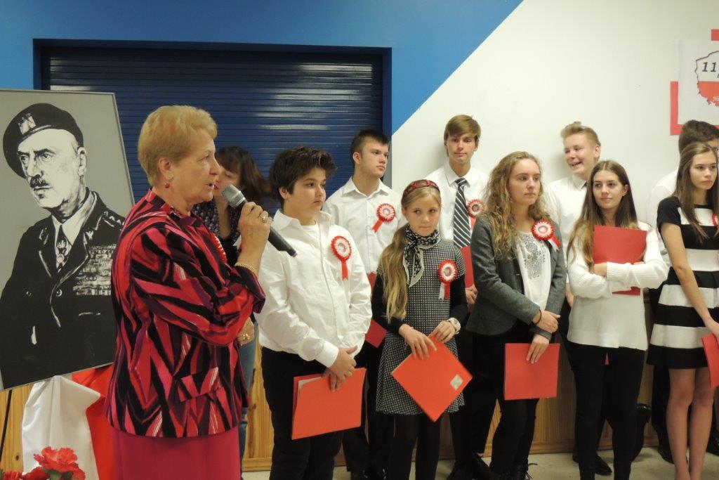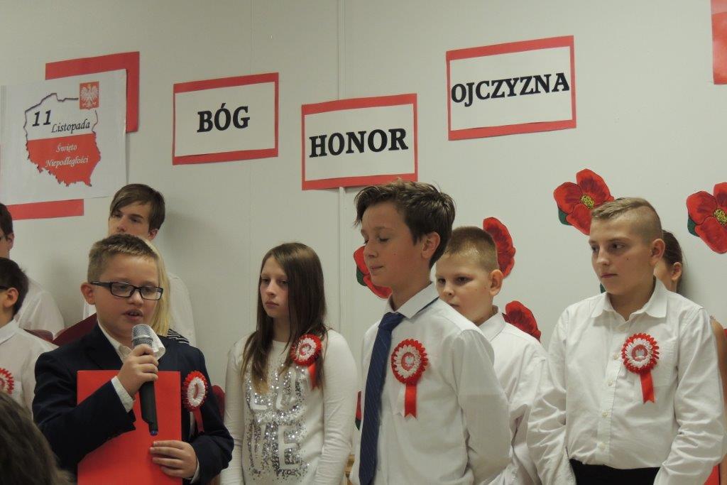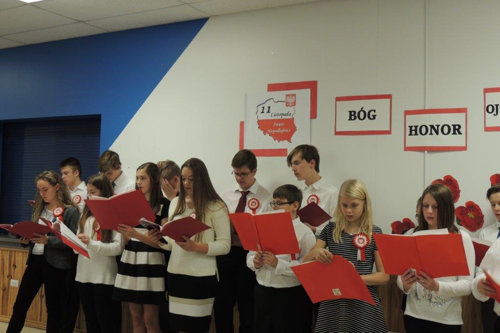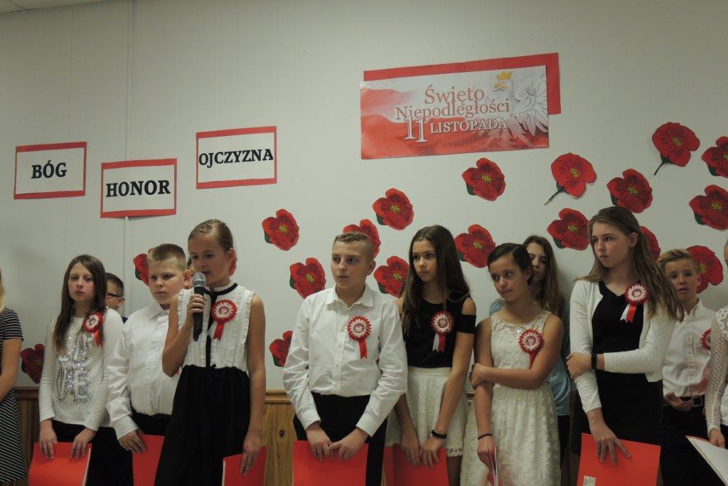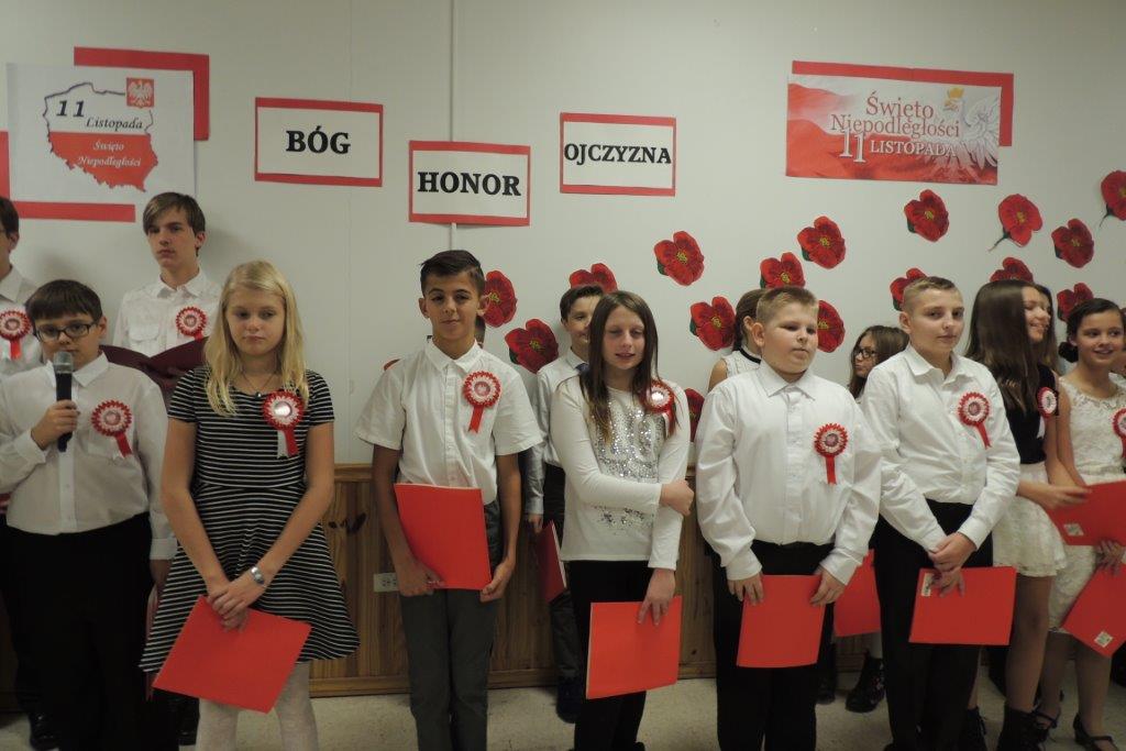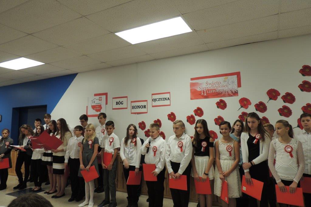 Przedstawione przez młodych recytatorów utwory poetyckie podkreślały nastrój lat walki i zmagań z zaborcami oraz entuzjazm z odzyskania wolności. Wszyscy zebrani wspólnie śpiewali pieśni narodowe, znane wszystkim Polakom m.in: “Wojenko, wojenko”, “Szara piechota”, “Marsz pierwszej brygady”. A na zakończenie przepięknie zabrzmiała pieśń nierozerwalnie związana z nasza szkoła -”Czerwone maki pod Monte Casino”. Uroczystości towarzyszyła prezentacja multimedialna, będąca wizualnym komentarzem do słów, które padały ze sceny, a patriotyczny charakter podkreślały przepiękne kotyliony i dekoracja w barwach narodowych. Nasza uroczystość była dla uczniów i wszystkich zebranych wspaniała lekcja historii i patriotyzmu.