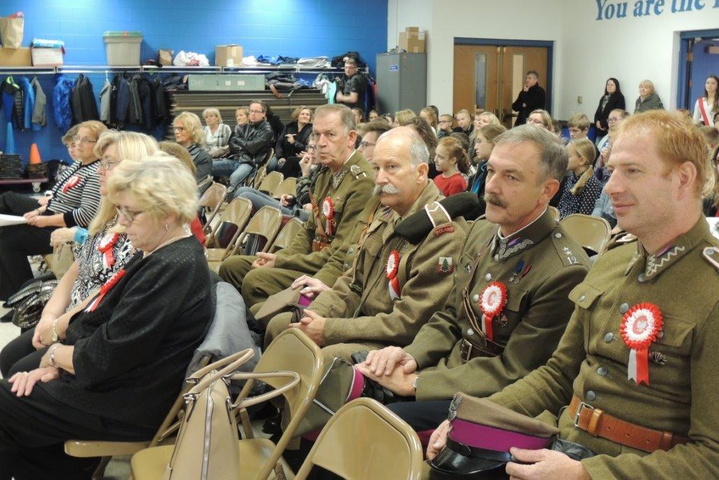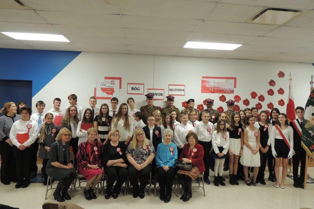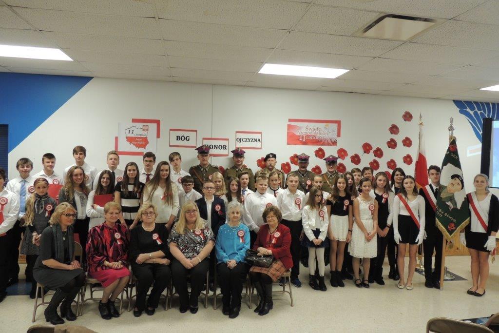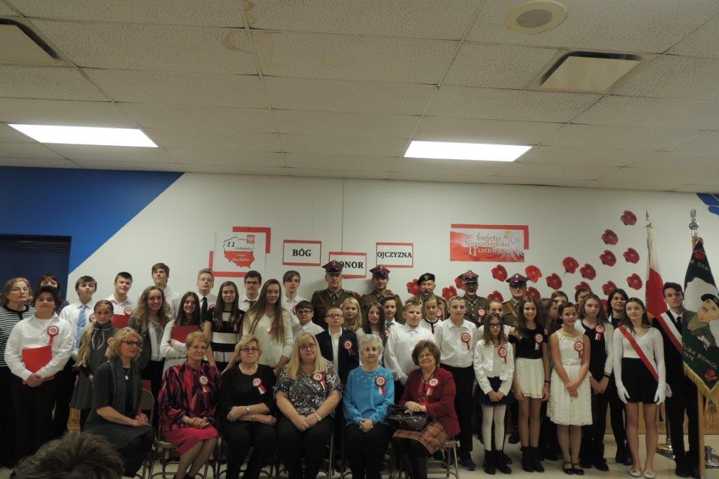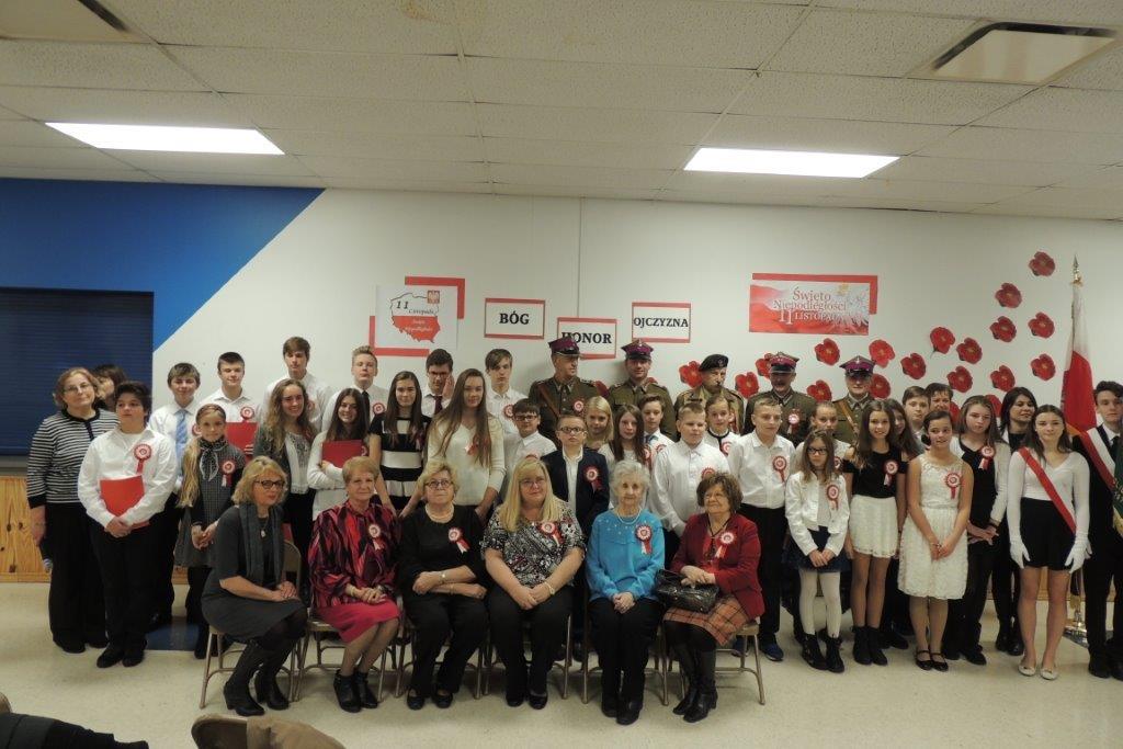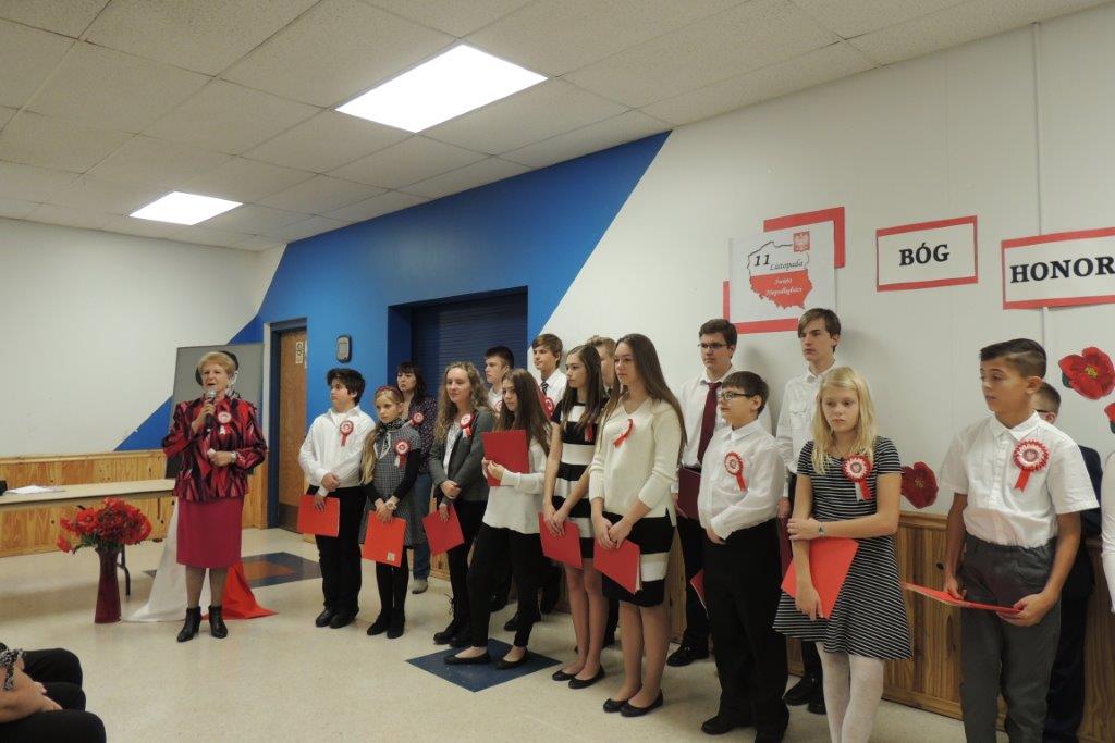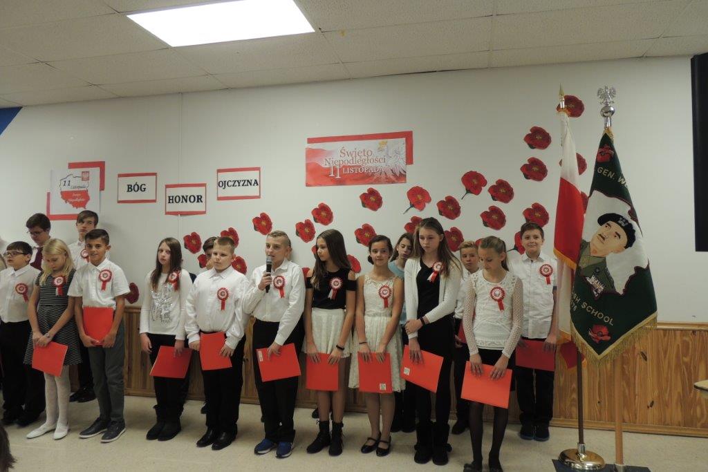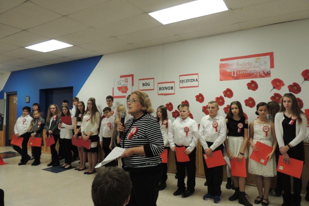 Przedstawione przez młodych recytatorów utwory poetyckie podkreślały nastrój lat walki i zmagań z zaborcami oraz entuzjazm z odzyskania wolności. Wszyscy zebrani wspólnie śpiewali pieśni narodowe, znane wszystkim Polakom m.in: “Wojenko, wojenko”, “Szara piechota”, “Marsz pierwszej brygady”. A na zakończenie przepięknie zabrzmiała pieśń nierozerwalnie związana z nasza szkoła -”Czerwone maki pod Monte Casino”. Uroczystości towarzyszyła prezentacja multimedialna, będąca wizualnym komentarzem do słów, które padały ze sceny, a patriotyczny charakter podkreślały przepiękne kotyliony i dekoracja w barwach narodowych. Nasza uroczystość była dla uczniów i wszystkich zebranych wspaniała lekcja historii i patriotyzmu.