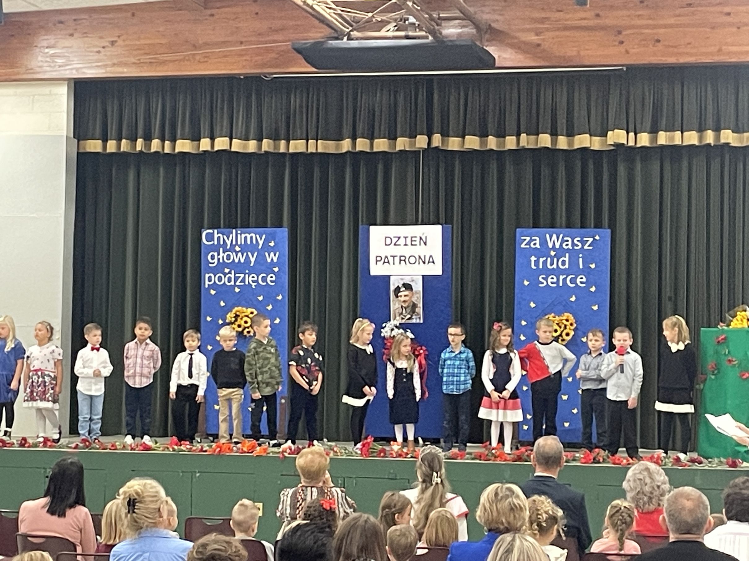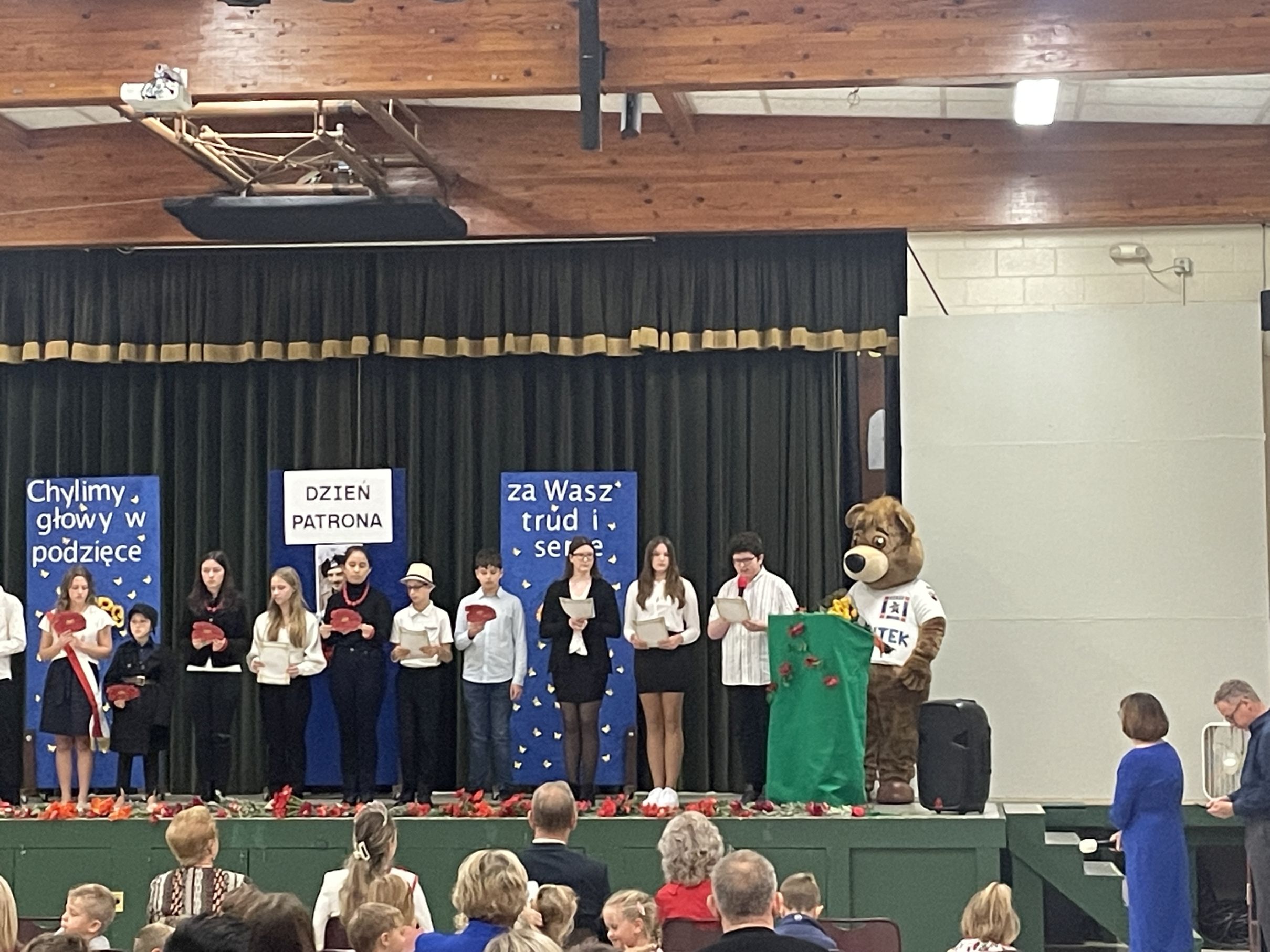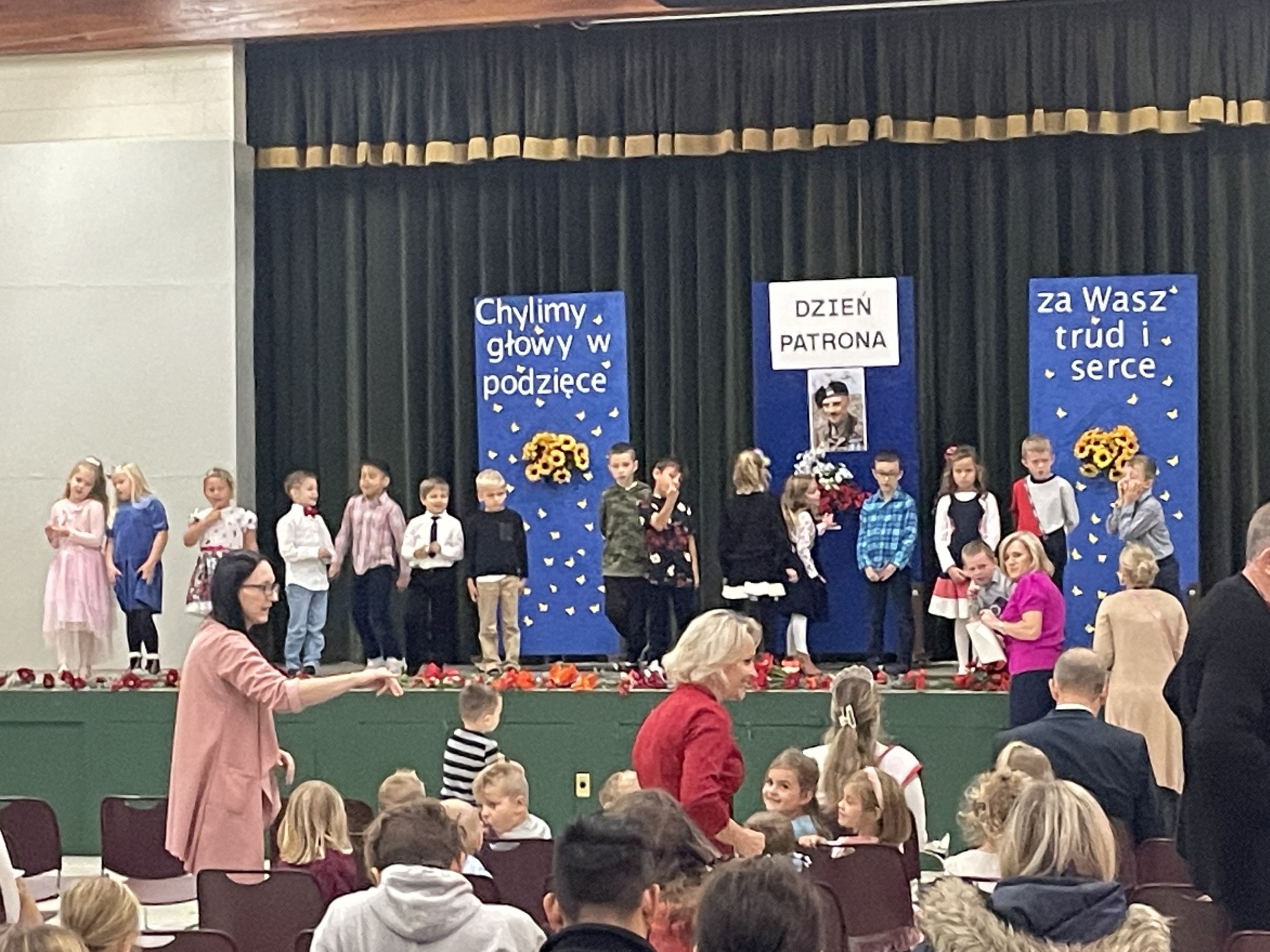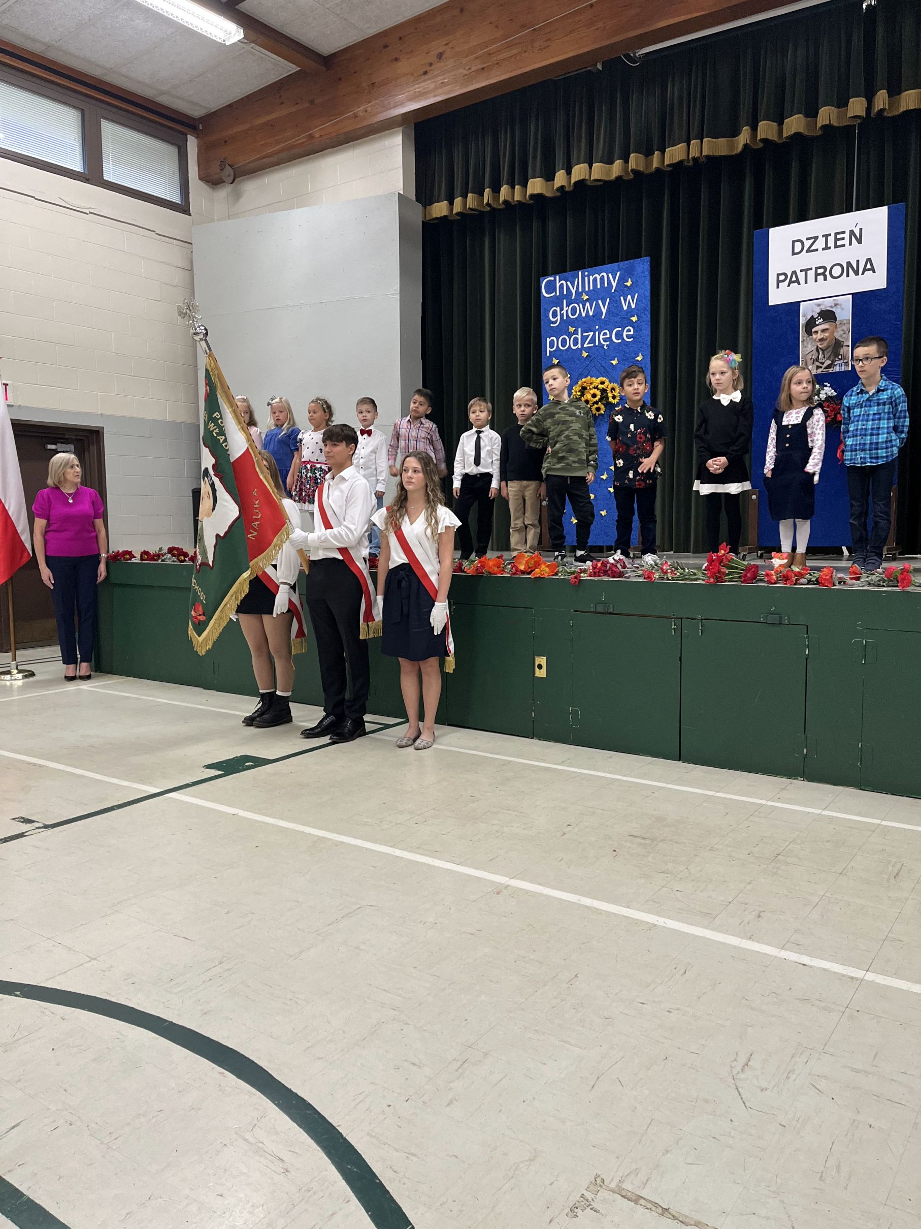Każdego roku w październiku  obchodzimy Dzień Patrona i Dzień Edukacji Narodowej popularnie nazwany Dniem Nauczyciela. Na naszej uroczystości byli obecni zaproszeni goście: p.Maria Serafin, pierwsza kierowniczka szkoły oraz wieloletnia nauczycielka, p.Tomasz Dąbrowski ze SWAP Placówki 90 w Chicago oraz Carolina Woźniczka, przedstawicielka Związku Klubów Polskich, pierwsza Dama Królowej Parady 3 Maja 2023.