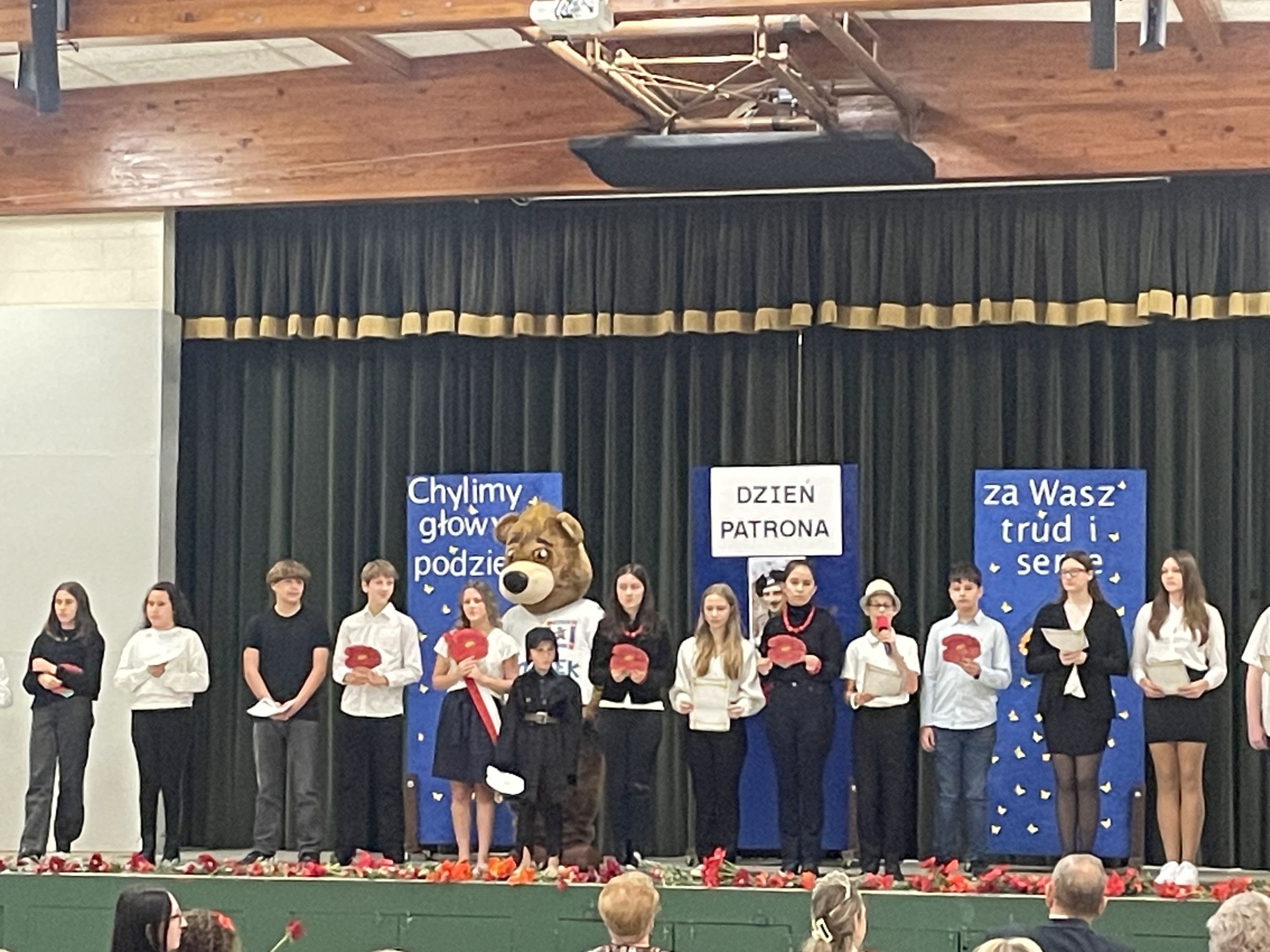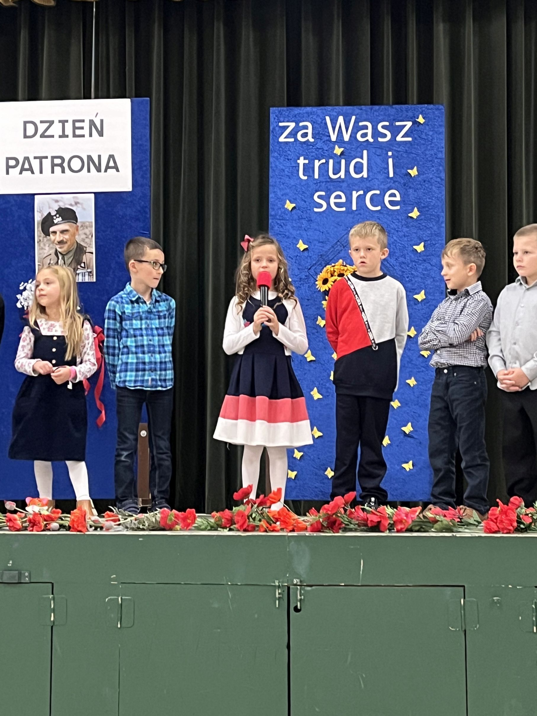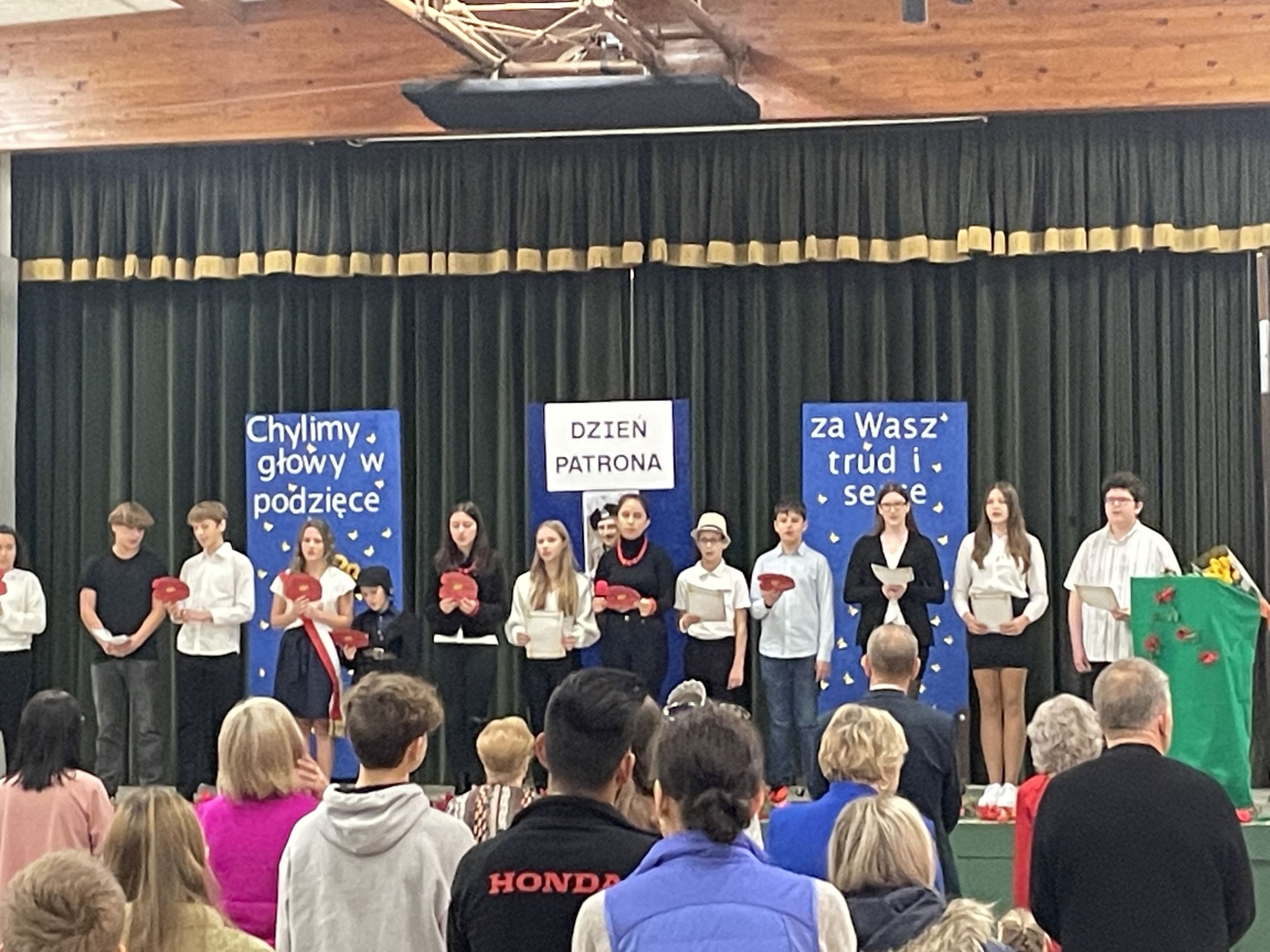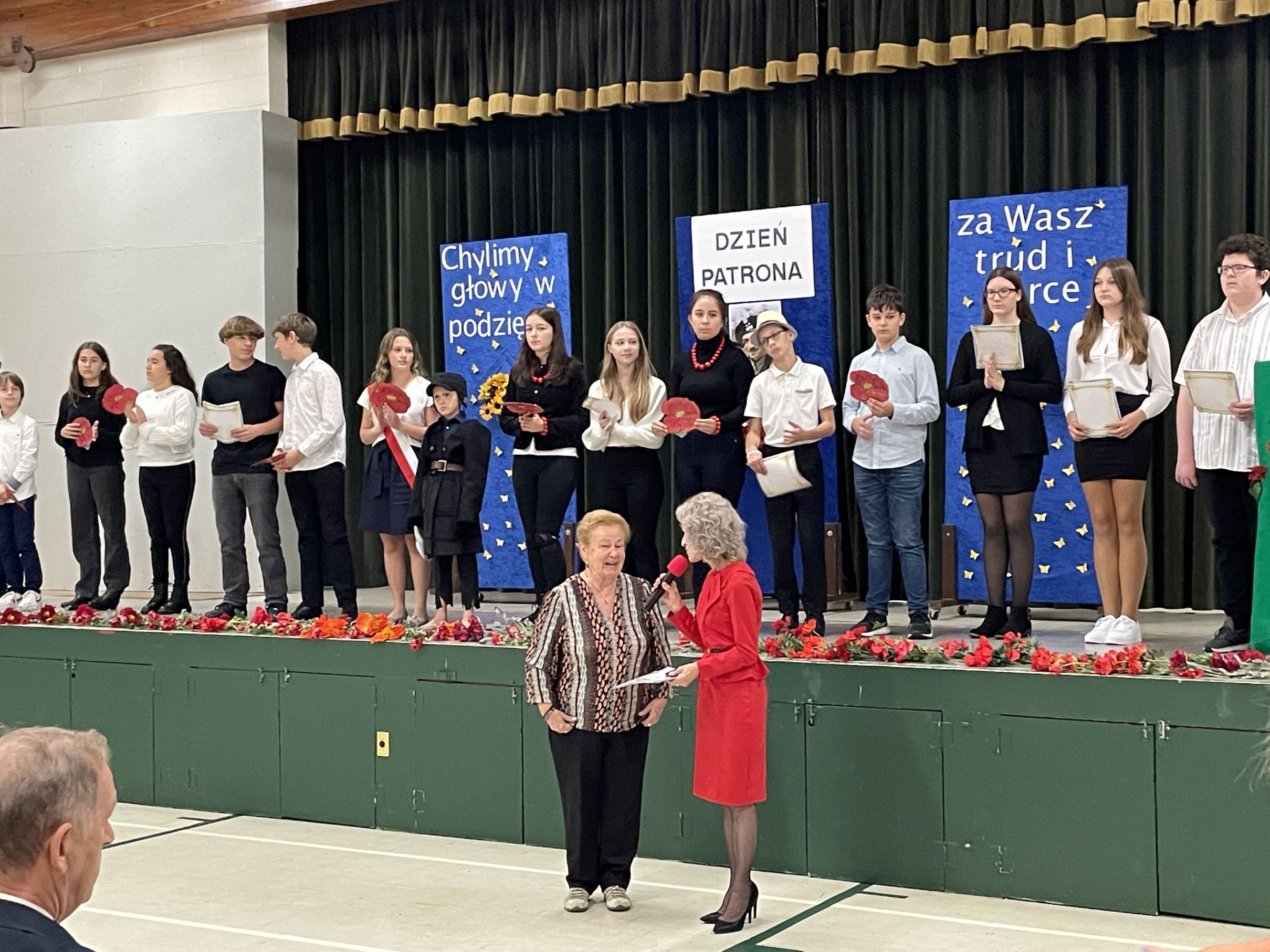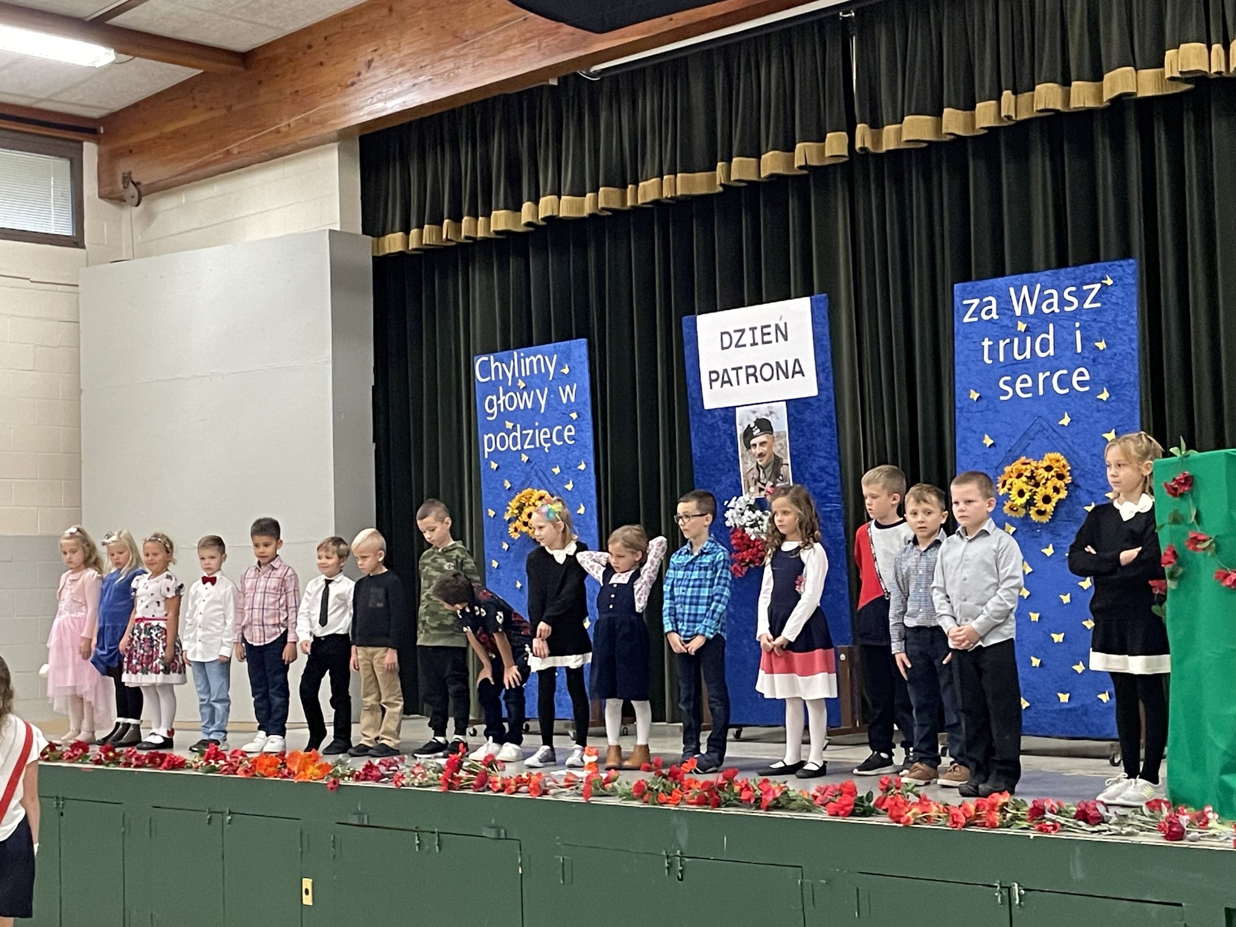 Każdego roku w październiku  obchodzimy Dzień Patrona i Dzień Edukacji Narodowej popularnie nazwany Dniem Nauczyciela. Na naszej uroczystości byli obecni zaproszeni goście: p.Maria Serafin, pierwsza kierowniczka szkoły oraz wieloletnia nauczycielka, p.Tomasz Dąbrowski ze SWAP Placówki 90 w Chicago oraz Carolina Woźniczka, przedstawicielka Związku Klubów Polskich, pierwsza Dama Królowej Parady 3 Maja 2023.