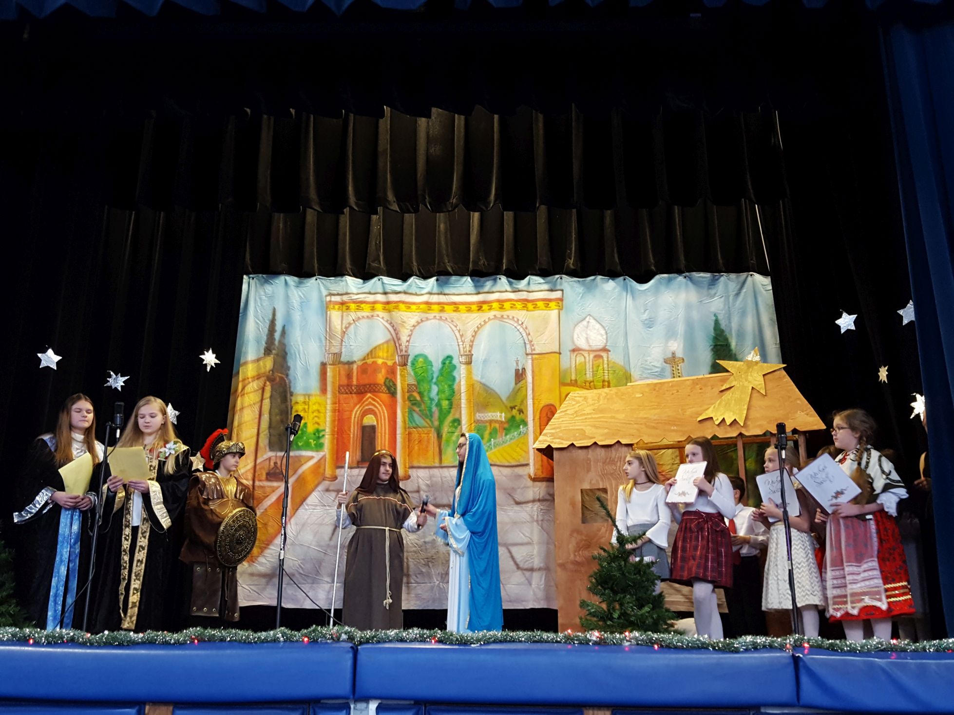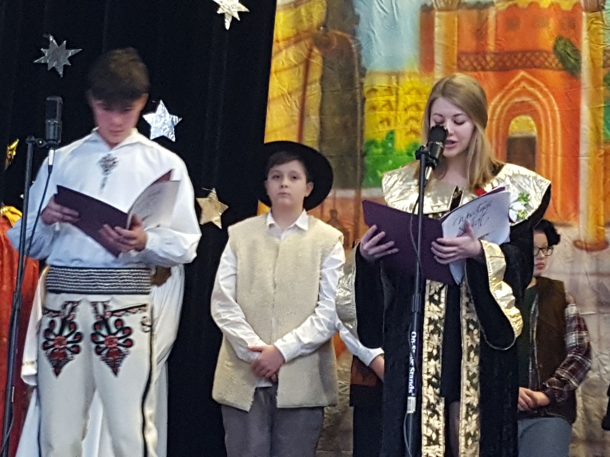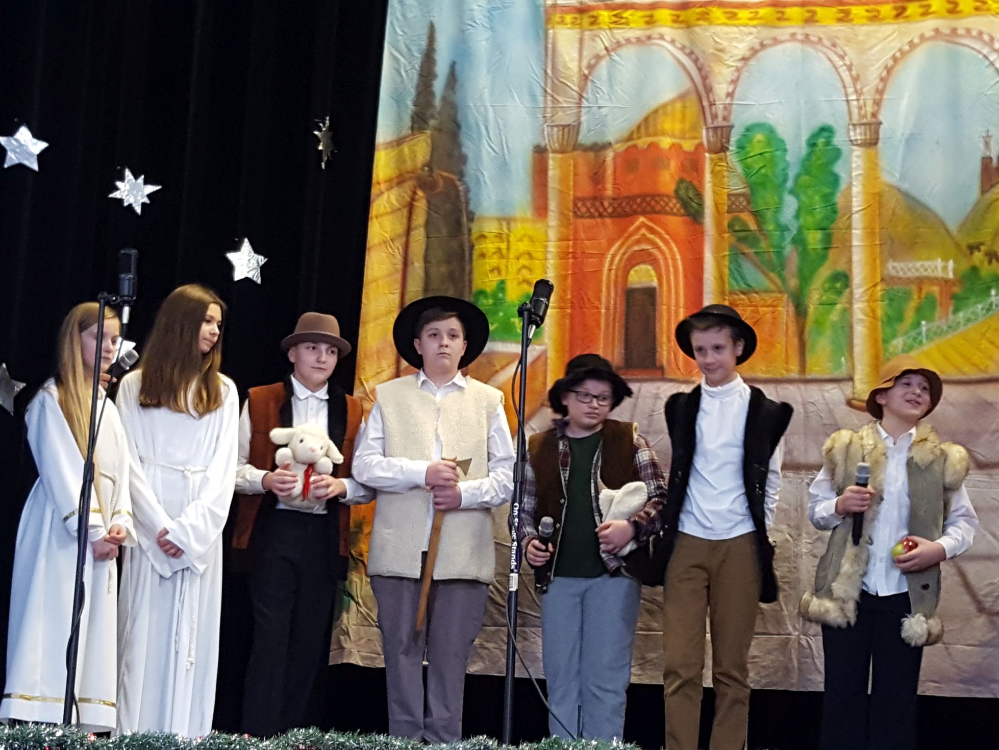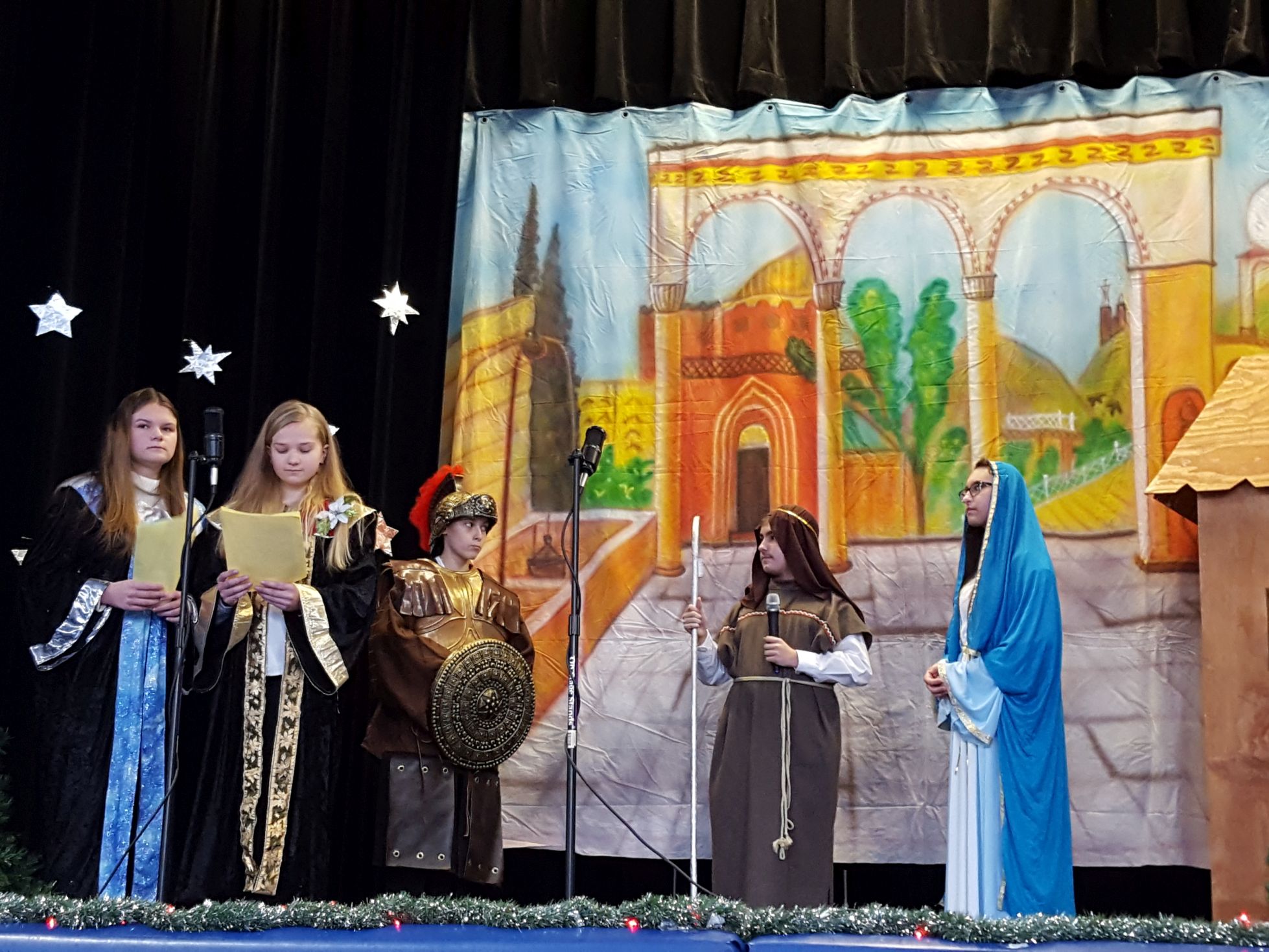 Coroczne przedstawienie jasełkowe to już tradycja naszej szkoły. Na początku spotkania życzenia świąteczne i noworoczne wszystkim złożyła p. Dyrektor Wanda Penar. W przedstawieniu wzięli udział uczniowie od przedszkola do kl.VIII oraz z kl. I i II liceum. Kolejny raz jasełka udowodniły, że w naszej szkole nie brakuje wspaniałych talentów.Narracja prowadzona przez Natalię Rak i Szymona Chryczyka przybliżyła historię związaną z narodzeniem Jezusa. Święta Rodzina w wykonaniu Dominiki Franczyk i Józia Jasienia przeniosła widzów do stajenki w Betlejem. Michał Franczyk pięknie zaśpiewał pastorałkę “Bosy pastuszek” a Karol Chmielewski doskonale wcielił się w króla Heroda. Uczniowie przygotowywali się z wielkim zaangażowaniem, pamiętając o powadze wydarzenia, jakim było przyjście na świat Zbawiciela. Zespół dzieci pod opieką Marioli Cichockiej odśpiewał kolędy i pastorałki, wprowadzając wszystkich w świąteczny i uroczysty nastrój. Przedstawienie zawierało wszystkie elementy tradycyjnych jasełek, była więc stajenka, Święta Rodzina, pastuszkowie,owieczki, aniołowie, Herod , Śmierć Diabeł i oczywiście Trzej Królowie. Na zakończenie jasełek dzieci z klasy V złożyły wszystkim świąteczne życzenia. Należy więc się cieszyć, że tradycja jasełek pozwala każdego roku zabłysnąć i pokazać się małym aktorom.