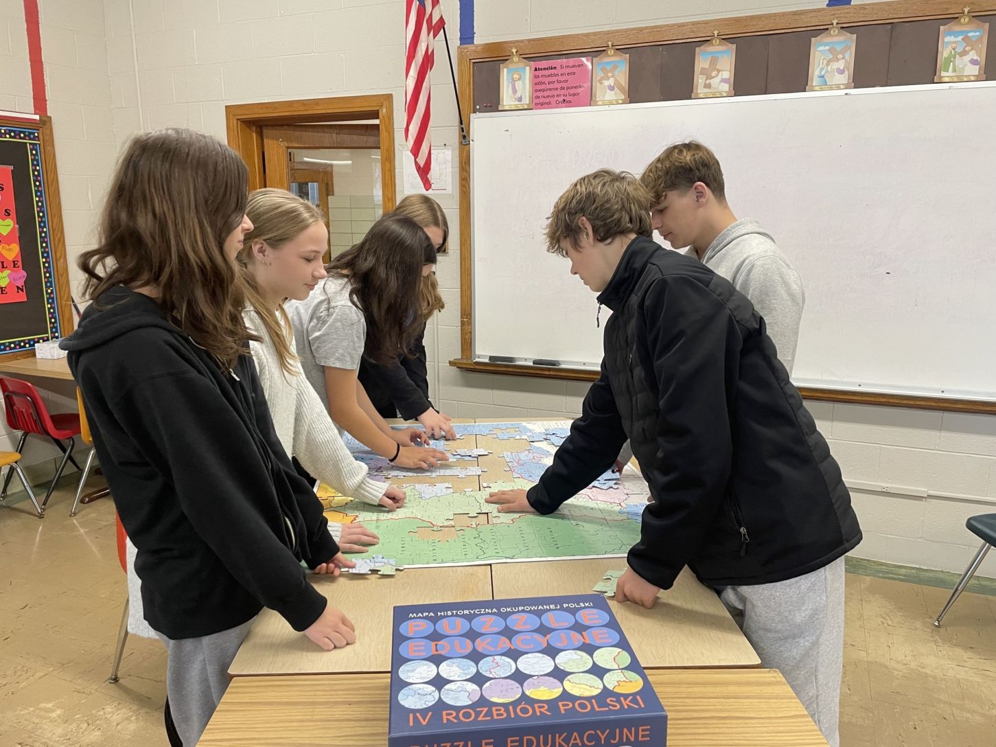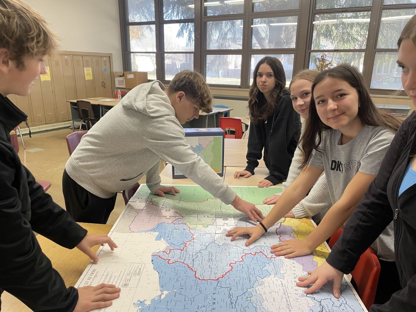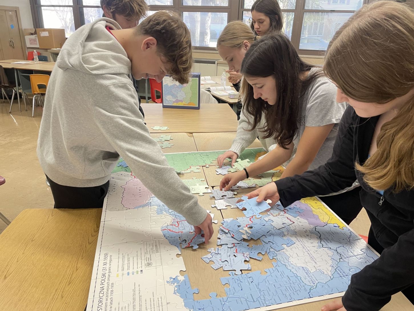 Gra Edukacyjna IV Rozbiór Polski, pomogła nam poznać czasy wojny obronnej w Polsce w 1939r. i konsekwencje okupacji. Filip Domon i Emmanuel Klimczuk szybko zabrali się do zbudowania mapy, a dziewczynki Natalia Cichowski, Natalia Rachwalski, Victoria Sawczak i Zuzia Twaróg z dużą cierpliwością wyszukiwały na mapie miast, w których miały miejsce widoczne na zdjęciach wydarzenia. Opisy po drugiej stronie zdjęcia dostarczyły cennych informacji. Udało nam się trudny temat zrealizować w atrakcyjny i dostępny dla naszych dzieci sposób!