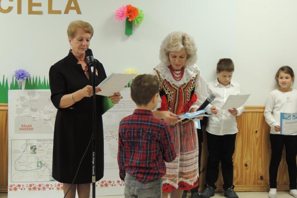 Wśród licznie zgromadzonych gości : weteranów, żołnierzy, przyjaciół szkoły, rodziców, grona pedagogicznego i uczniów rozbrzmiewały piękne strofy wierszy, pieśni i oczywiście wzruszająca pieśń o czerwonych makach na Monte Cassino, których czerwień kojarzy się z przelana krwią Polskich żołnierzy.